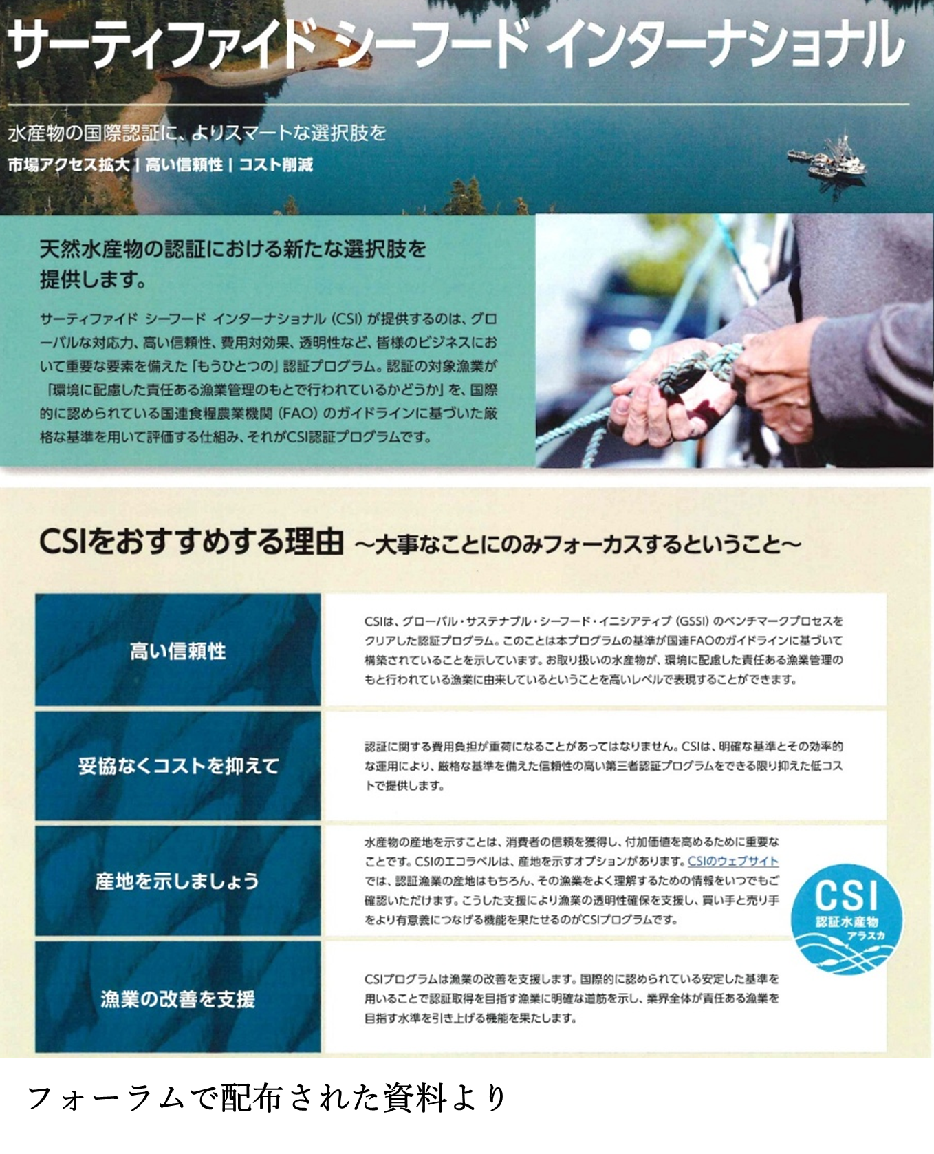日本で既に4社がCSIのCoC認証を取得しておられ、日本生協連様も積極的に認証商品を取扱うとの方針の報告がありました。CSIの一行はフォーラム後、水産庁はじめ関係先への説明を精力的に行われ、手応えを感じた様です。